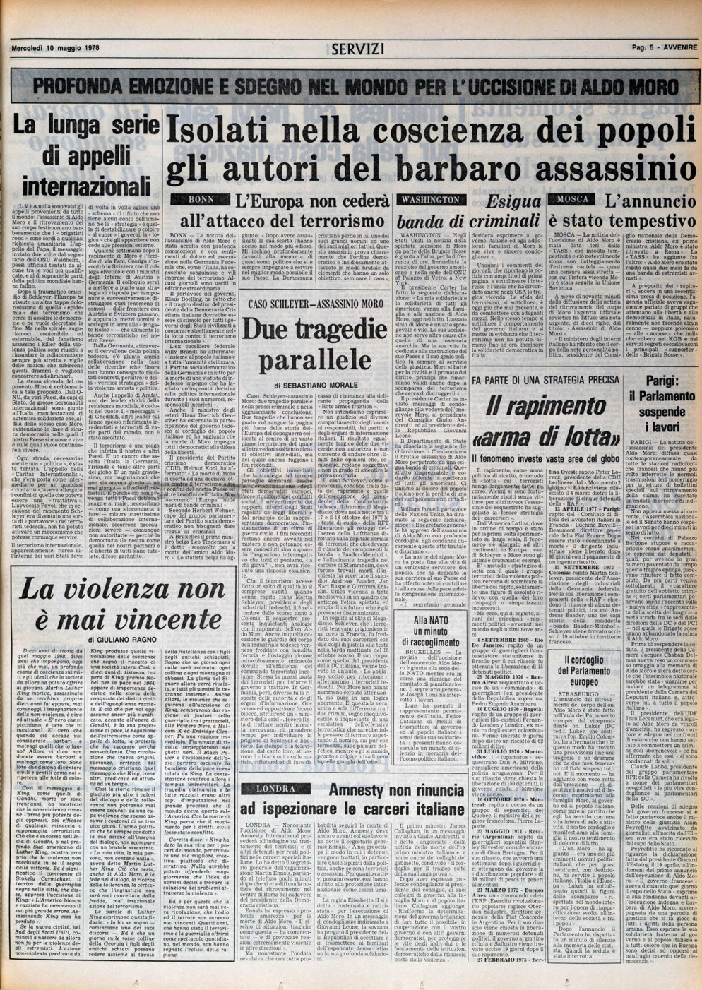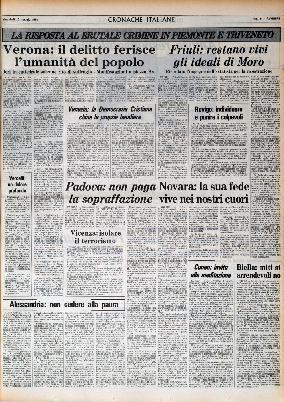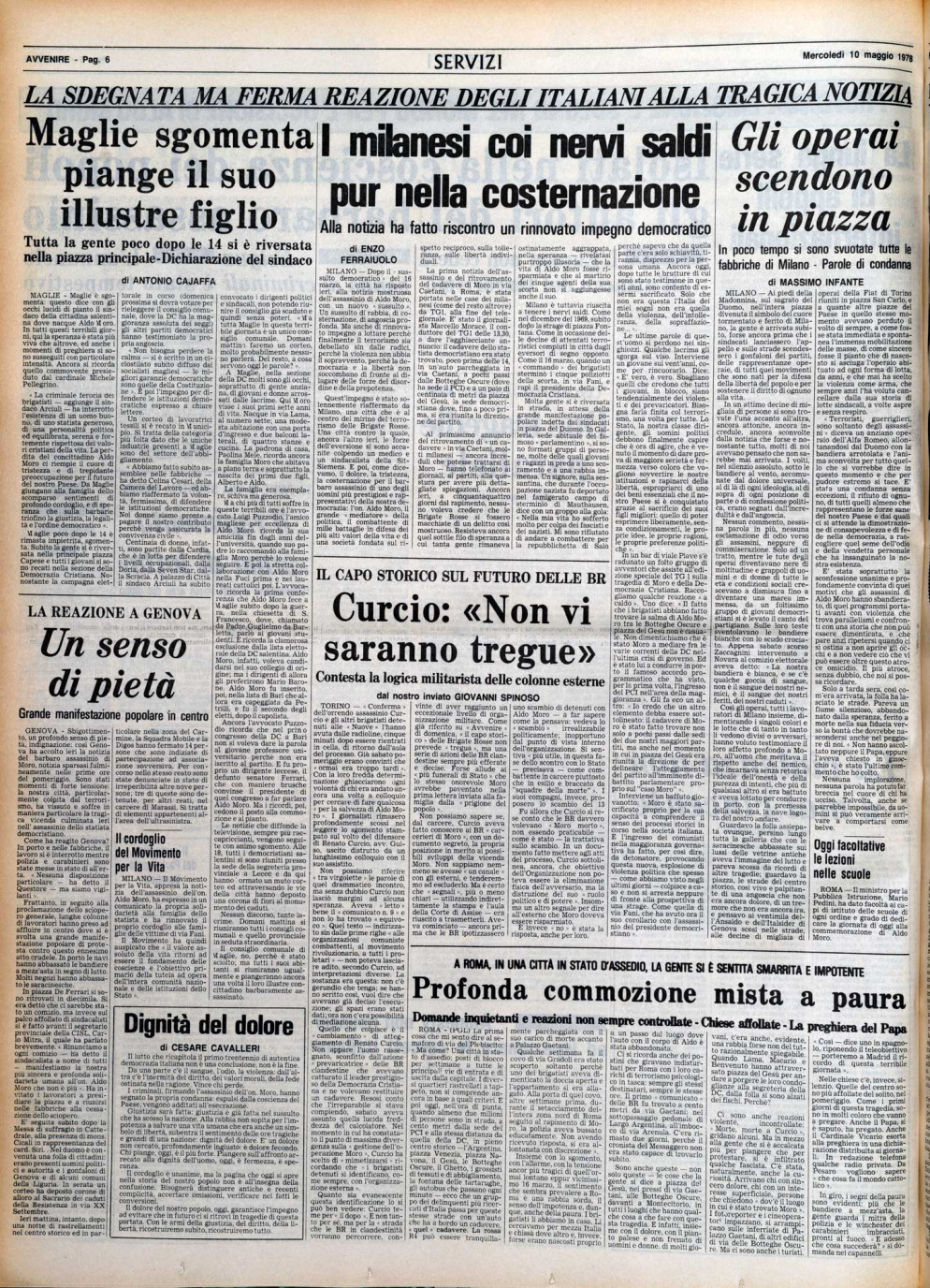 L'emozione suscitata dal ritrovamento del corpo di Moro nella seconda pagina di Avvenire del 10 maggio 1978