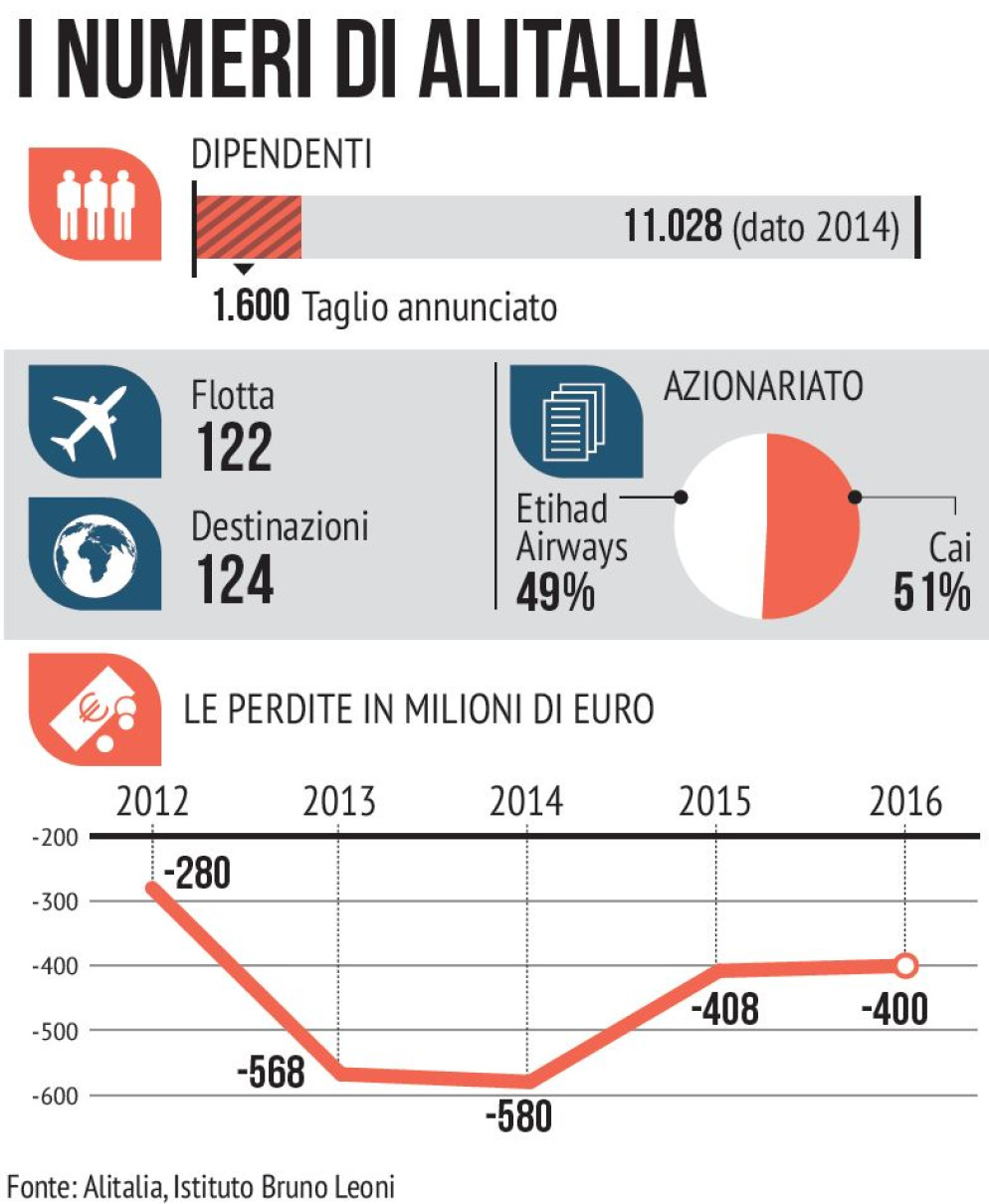 600-650 milioni. Sono le perdite stimate per il 2016. In particolare dal 2009, cioè dalla privatizzazione in poi il gruppo ha perso 327 milioni nel 2009, 69 milioni nel 2011, 280 milioni nel 2012, 568 milioni nel 2013, 580 milioni nel 2014, 199 milioni nel 2015.