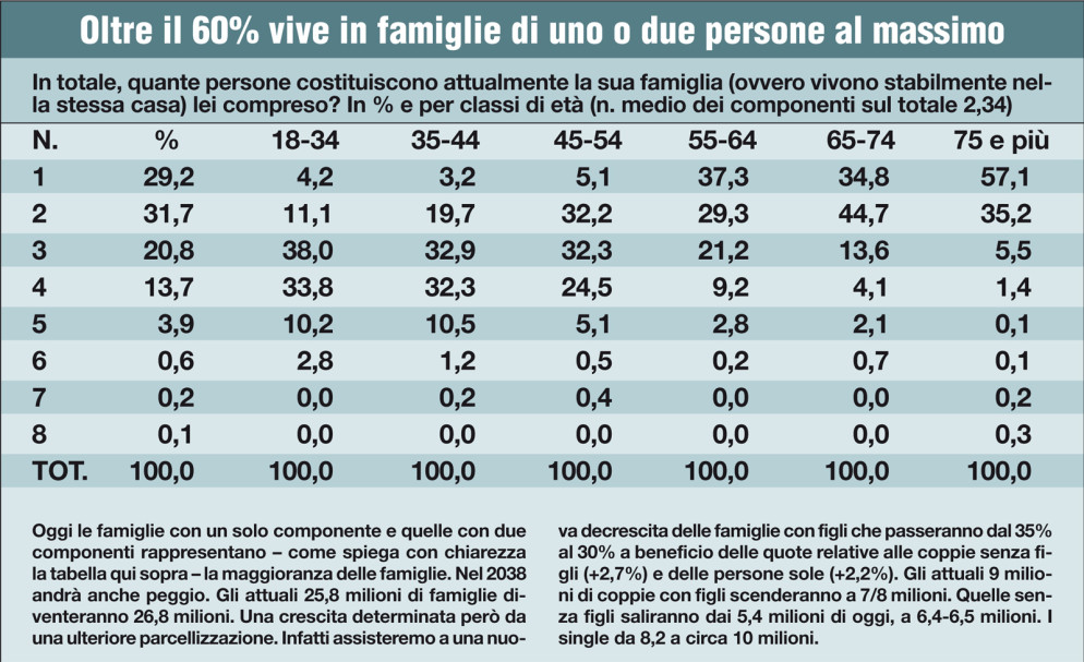 Le proiezioni statistiche per il futuro familiare dei giovani 25-34enni maschi sono desolanti. Nei prossimi vent’anni quasi 6 su 10 (57%) tenderanno a rimanere nella famiglia di origine. Il 13% pensa a far famiglia con figli, il 10% senza figli. C’è poi un 19% che ipotizza di vivere da solo, ma senza progetti. E le ragazze. Il 47% pensa di rimanere a casa con i genitori. Solo il 25% pensa di sposarsi e avere figli.