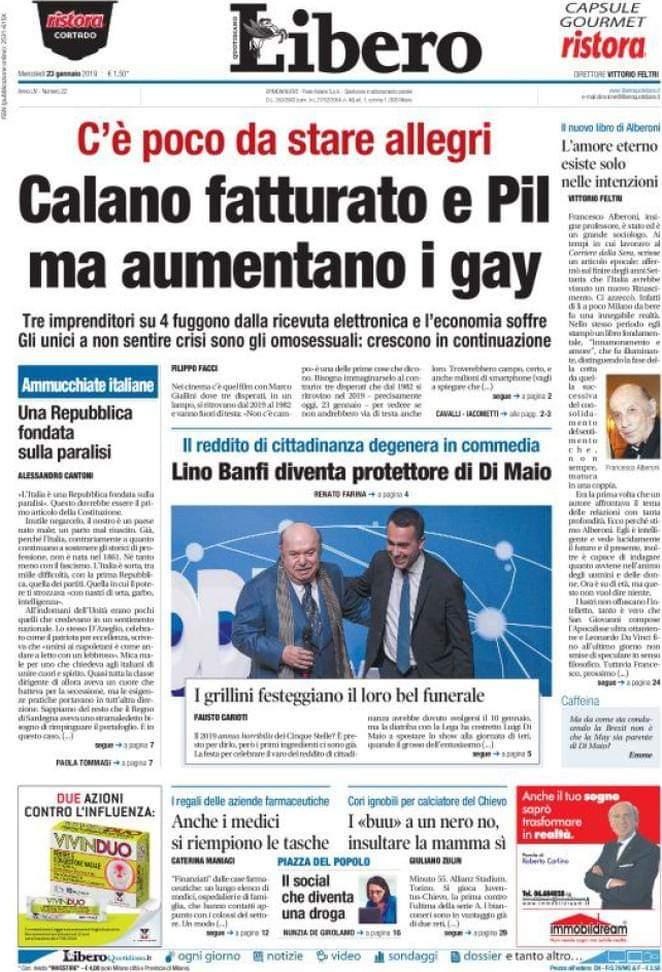 I titoli di Libero, in un paese che fosse ancora memore del Bagaglino, invece di averlo mandato al governo, produrrebbero un’annoiata alzata di spalle come le brutte battute scurrili. Ma il Bagaglino è andato al governo, e c’è un sottosegretario alla presidenza del Consiglio con delega all’Editoria, Vito Crimi si chiama, del Movimento cinque stelle, che subito dichiara: “Provo disgusto per il titolo del giornale Libero (foto sotto). Un giornale che riceve soldi pubblici che prima pubblica titoli razzisti, poi oggi anche omofobi. Avvierò immediatamente una procedura interna per vagliare la possibilità di bloccare l’erogazione dei fondi residui spettanti ad un giornale che offende la dignità di tutti gli italiani e ferisce la democrazia”.