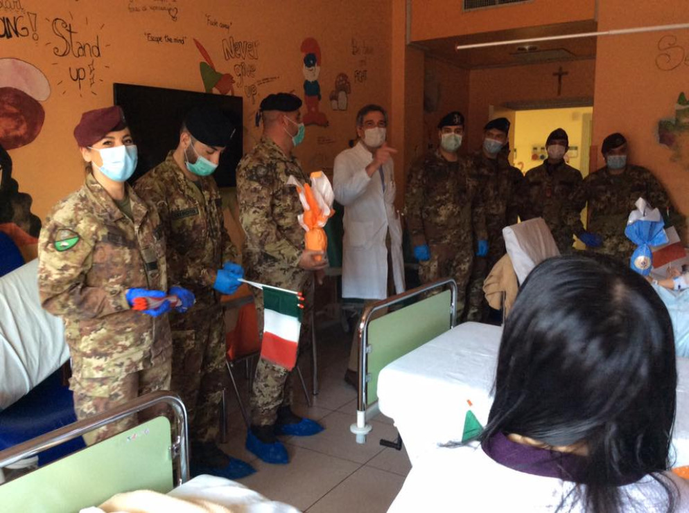 Sorrisi, un dolce pensiero e bandierine per i piccoli ricoverati in Pediatria. Nella mattinata di mercoledì 8 aprile i bambini degenti in reparto hanno ricevuto la visita dei militari dell’Esercito Italiano che in questi settimane stanno prestando servizio a Piacenza per supportare i colleghi sanitari nella lotta al covid19.