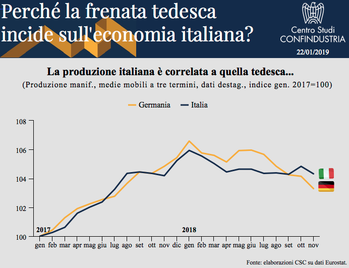 Nel complesso, l’Eurozona subisce una sforbiciata dello 0,3 per cento, per un pil 2019 previsto in aumento dell’1,6 per cento. Questo riflette, dice il Fmi, “in parte l'indebolimento del ritmo di crescita registrato nella seconda metà del 2018 – come in Germania dopo l’introduzione dei nuovi standard di emissione per le automobili”. La debolezza dell’industria tedesca dovrebbe essere motivo di preoccupazione in Italia. Se infatti il rallentamento italiano è conclamato – Banca d’Italia infatti ha previsto la recessione alla fine dell’anno scorso con due trimestri di crescita negativa – potrebbe aggravarsi in futuro proprio per le doglie dell’industria in Germania.