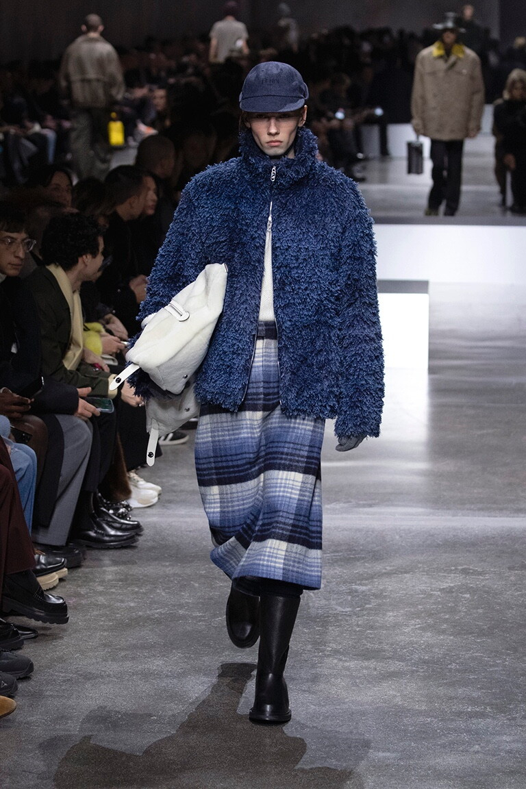 N come natura (matrigna). La rappresentazione plastica e contemporanea del dilemma del pastore leopardiano trova la propria compiutezza nella scenografia concepita dallo Studio di Rem Koolhas per questa sfilata (che, presumibilmente, resterà similare anche il mese prossimo per la sfilata donna inverno 2024): un immenso pavimento di vetro che nella parte superiore alloggia un ufficio e in quella inferiore un prato, acqua che scorre, foglie cadute. L’immutabile, ricca e armoniosa bellezza della natura contro il rigore, pur elegante ma pur sempre un po’ alienante, dell’intervento umano. “Svelando la paradossale dicotomia tra questi due mondi coesistenti, la sfilata esplora le verità fondamentali dell’umanità, i nostri istinti naturali, i nostri bisogni emotivi”, è scritto nelle note. “Alla base c’è la semplice affermazione del bisogno umano profondo ed essenziale di entrare in contatto con il mondo circostante”. Il ritmo delle stagioni e l’ordine naturale delle cose determinano i gesti che caratterizzano i capi, che a loro volta rispecchiano e reagiscono al contesto in cui si trovano, a questi ambienti disparati e distinti, interni ed esterni. “Questa collezione”, dicono i direttori creativi Miuccia Prada e Raf Simons, “affronta qualcosa di essenziale: l’istinto emotivo innato di rimanere legati a qualcosa che conosciamo, ai cicli della natura. Un mondo fatto di stagioni climatiche, non una realtà artificiale”.