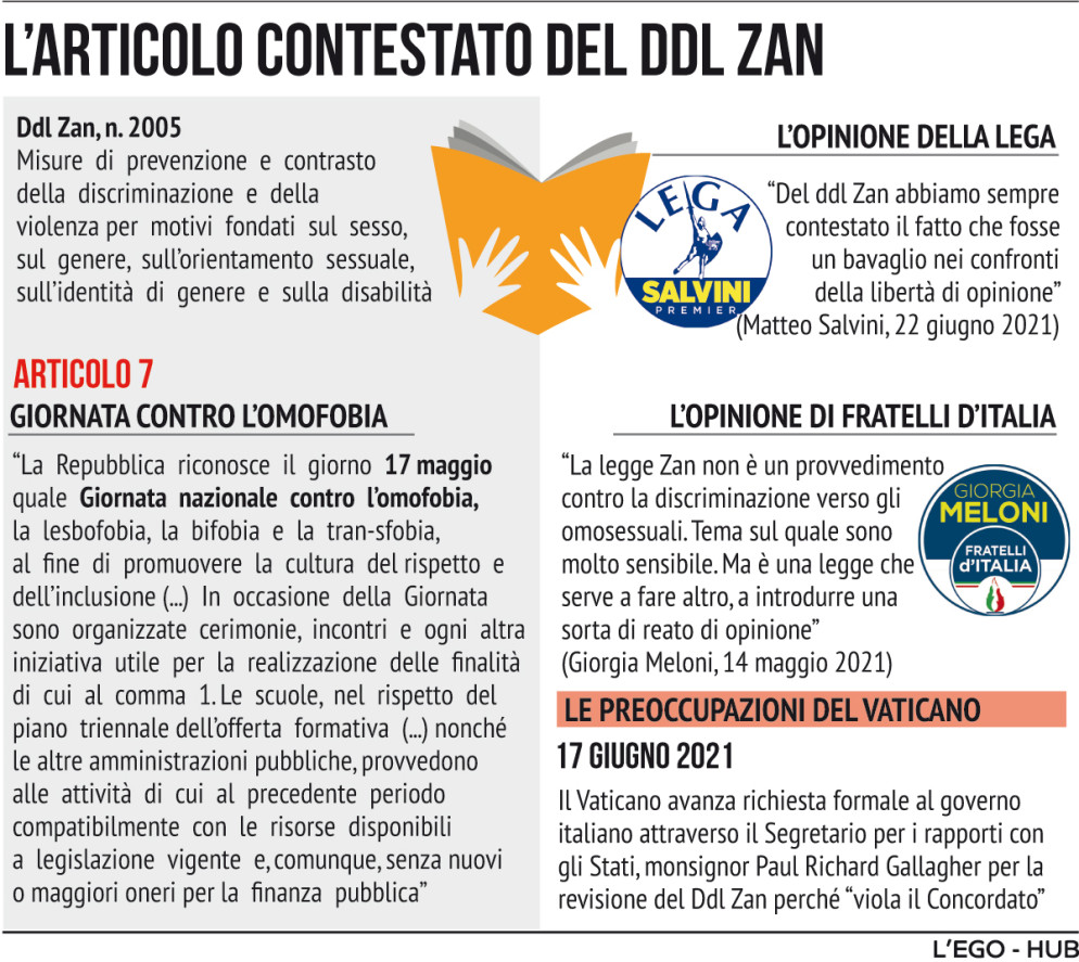 Un dialogo fra sordi, con la Lega indisponibile a eliminare l’emendamento a prima firma Roberto Calderoli (in grado, astrattamente, di far bocciare la legge ancor prima di entrare nel merito) e il Pd non in grado, anche per l’assenza degli altri due partiti, di garantire l’eliminazione dei punti controversi, ossia la definizione di identità di genere (articolo 1) il rischio di reato di opinione (scaturente dall’articolo 4) e le iniziative nelle scuole (previste all’articolo 7). «Non era proponibile - spiega il Ostellari - il ritiro dell’ememdamento senza un impegno per le modifiche nel merito».