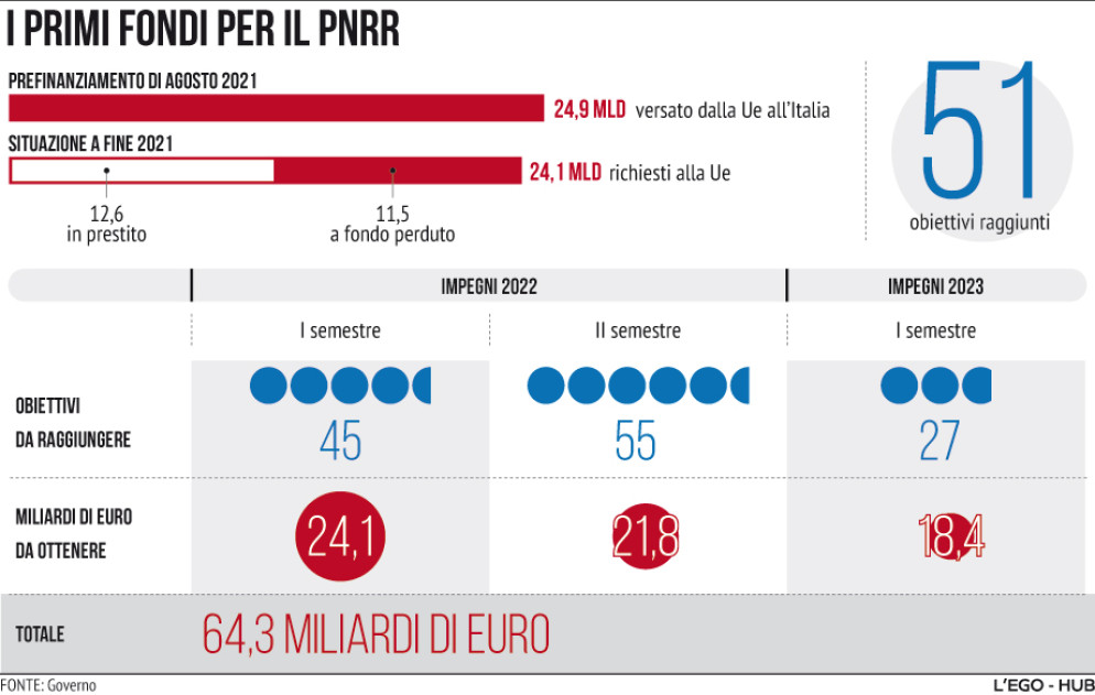 MISSIONI, ASSI E RISORSE Il Pnrr si articola in 16 componenti, raggruppate in 6 missioni - digitalizzazione e compe-titività (40 miliardi), rivoluzione verde (59), mobilità sostenibile (25), istruzione e ricerca (31), coesione (20) e salute (15) - che si muovono su 3 assi: innovazione, transizione ecologica e inclusione sociale. Gli obiettivi che deve raggiungere possono essere qualitativi (milestones) e quantitativi (target). Lo Stato paga le opere e le riforme e l’Europa le rimborsa. La prima rata da rendicontare alle istituzioni europee si è esaurita il 31 dicembre. Le risorse saranno erogate solo in seguito alla verifica del raggiungimento dei 51 traguardi e obiettivi previsti per quello step, di cui 27 sono connessi all’attuazione di riforme e 24 all’attuazione di investimenti. Nel 2022 vanno centrate 83 milestones e 17 target: dalla lotta al caporalato a quella contro l’evasione fiscale, dalla spending review al codice degli appalti. Sempre quest’anno dovremo risolvere i problemi della sanità territoriale e far partire gli appalti per la banda larga. Noi italiani abbiamo concordato con l’Europa di investire su digitalizzazione e innovazione, transizione ecologica e inclusione sociale, parità di genere, miglioramento delle competenze, della formazione e dell’occupazione giovanile, Mezzogiorno (dove si concentrerà il 40% delle risorse investite nei territori) e adattamento ai cambiamenti climatici, uso sostenibile e protezione delle risorse idriche e marine, economia circolare, riduzione dell’inquinamento dell’aria, dell’acqua o del suolo… e prima di darci i soldi, Bruxelles vorrà verificare l’efficacia degli interventi. Numeri alla mano: ad esempio, le spese fatte per fronteggiare la dispersione scolastica saranno valutate sulla base del tasso di abbandono scolastico. Il tema occupazionale sarà centrale. Ci si aspetta che il Pnrr porti il tasso di crescita italiano dallo 0,6 all’1,4%. Guerra permettendo.
