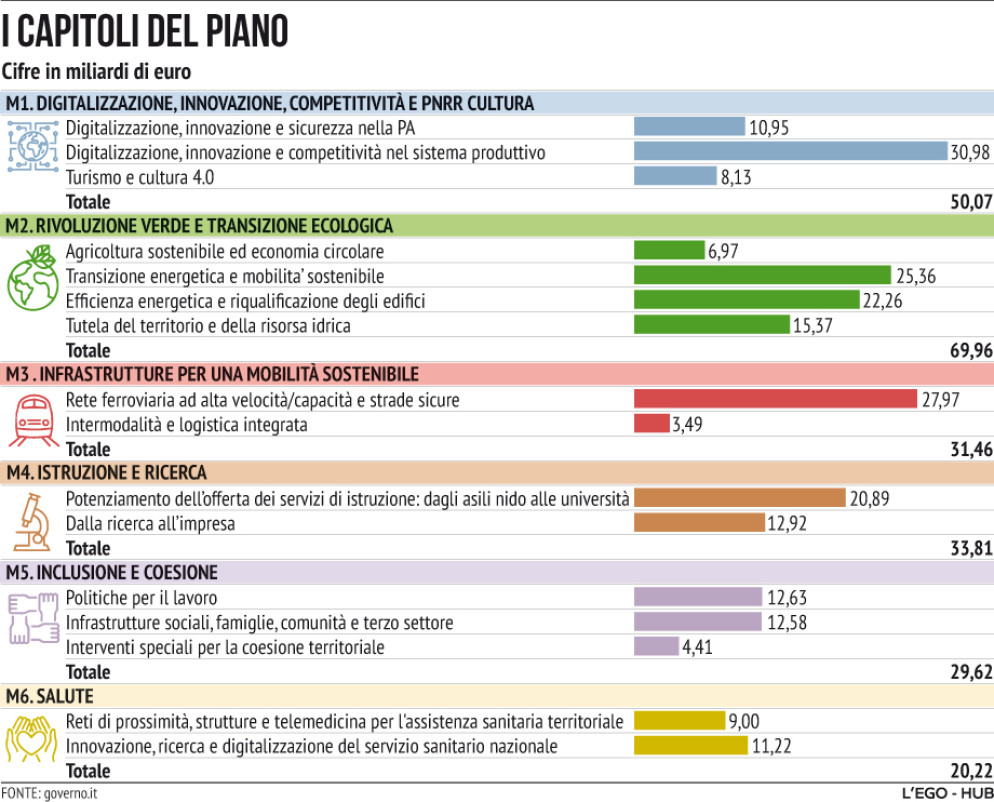 Il Piano Nazionale di Ripresa e Resilienza 'Italia domani', partito nella seconda metà del 2021, indica come saranno usate le risorse destinate all’Italia dal programma Next Generation Eu: 191,5 miliardi di euro, di cui 68,9 a fondo perduto e 122,6 in prestito, cui si aggiungono fondi che porteranno il totale a 235 miliardi (14% del Pil nazionale). Il piano finanzierà 134 investimenti e 63 riforme che serviranno a «rilanciare il Paese dopo la crisi pandemica, stimolare la transizione ecologica e digitale, favorire un cambiamento strutturale dell’economia, a partire dal contrasto alle diseguaglianze di genere, territoriali e generazionali », come ha detto Draghi in Parlamento.