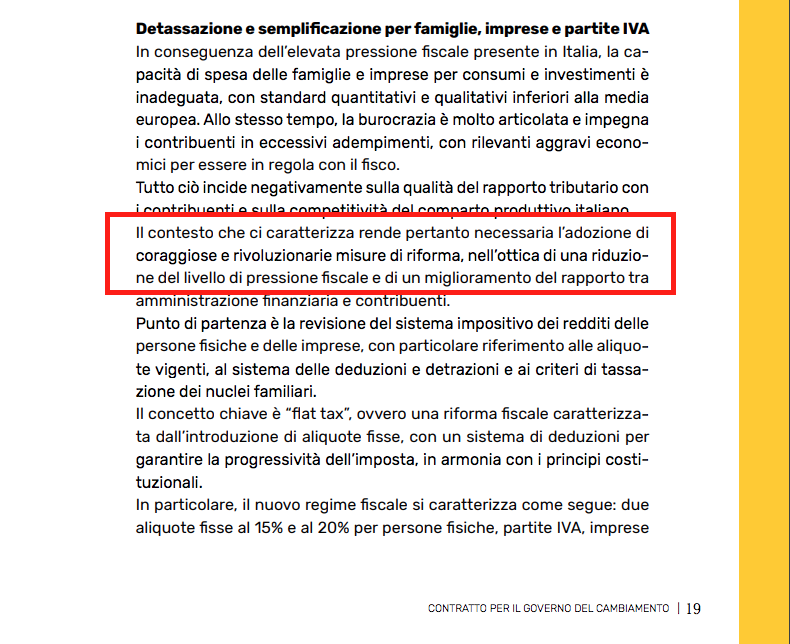Eppure il contratto di governo siglato da Lega e M5s è chiarissimo: “Il contesto che ci caratterizza rende pertanto necessaria l’adozione di coraggiose e rivoluzionarie misure di riforma, nell’ottica di una riduzione del livello di pressione fiscale e di un miglioramento del rapporto tra amministrazione finanziaria e contribuenti”.