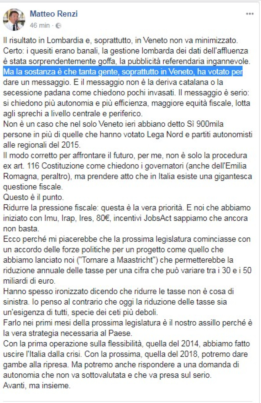 "Il risultato in Lombardia e, soprattutto, in Veneto non va minimizzato. Tanta gente, soprattutto in Veneto, ha votato per dare un messaggio: si chiedono più autonomia e più efficienza, maggiore equità fiscale, lotta agli sprechi a livello centrale e periferico»; così su Facebook il segretario del Pd Matteo Renzi.