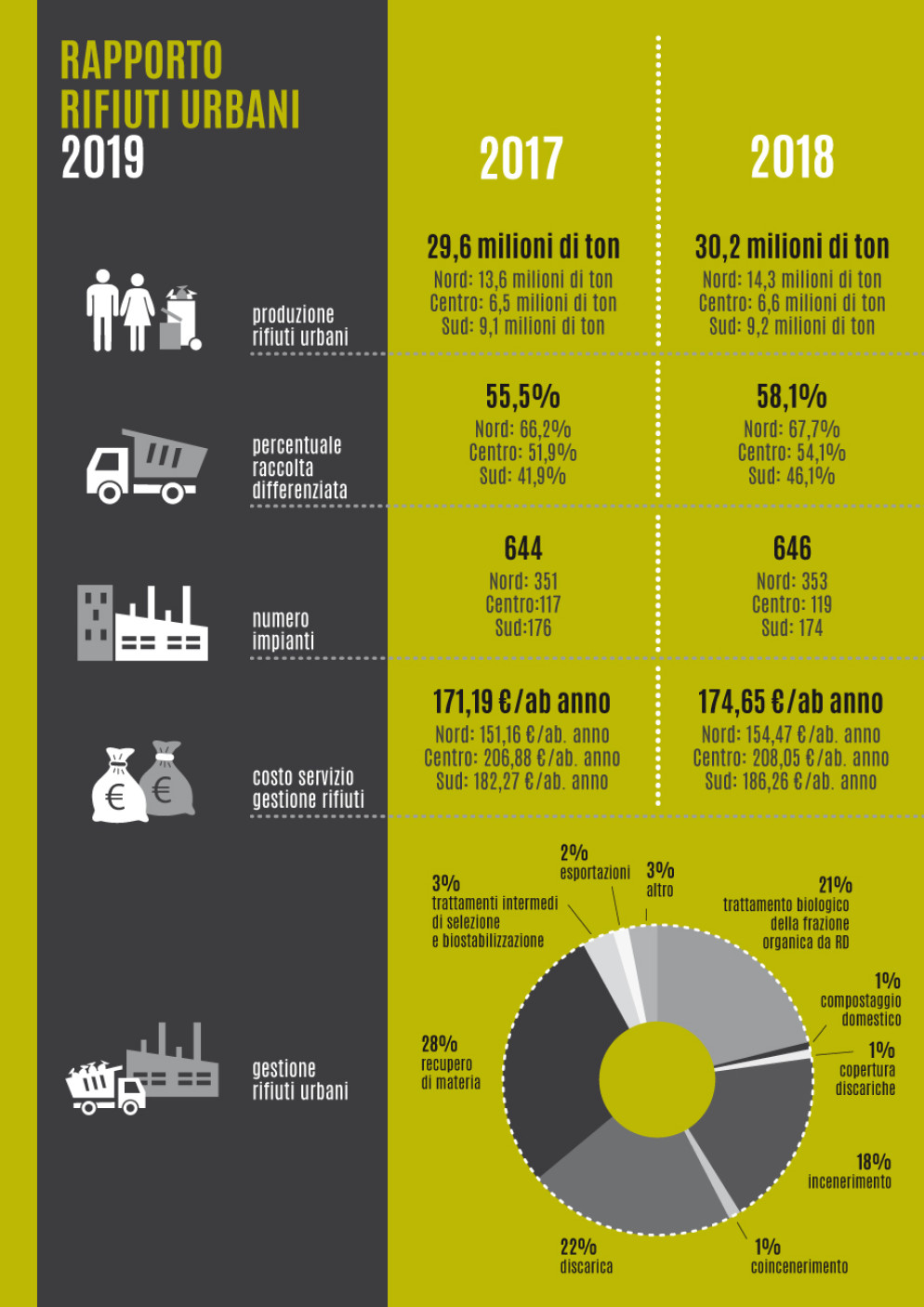 E anche qui le differenze saltano agli occhi. Infatti su 38 impianti operativi, il 68% si trova al Nord, in particolare in Lombardia e in Emilia Romagna. Tutto questo porta anche a costi molto diversi per i cittadini. Nel 2018, il costo medio nazionale annuo pro capite è stato di 174,65 euro/ab per anno (nel 2017 era 171,19). Al Centro i costi più elevati (208,05 euro), segue il Sud con (186,26 euro) e il Nord (154,47 euro).