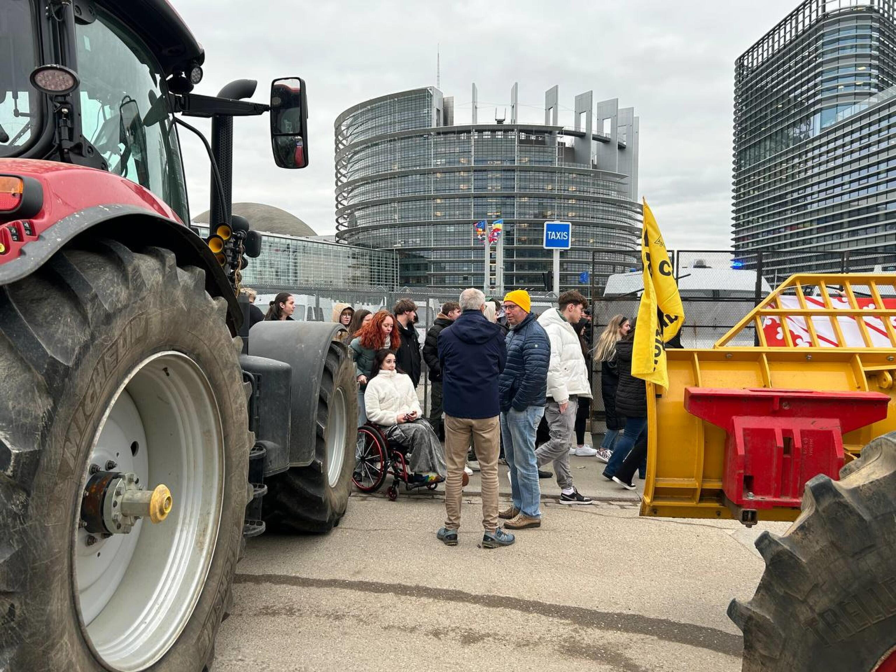 Le bandiere che si vedono sono francesi e belghe, mentre i cartelli riportano frasi contro gli Ogm e le nuove tecniche genomiche, in discussione proprio oggi alla plenaria.
