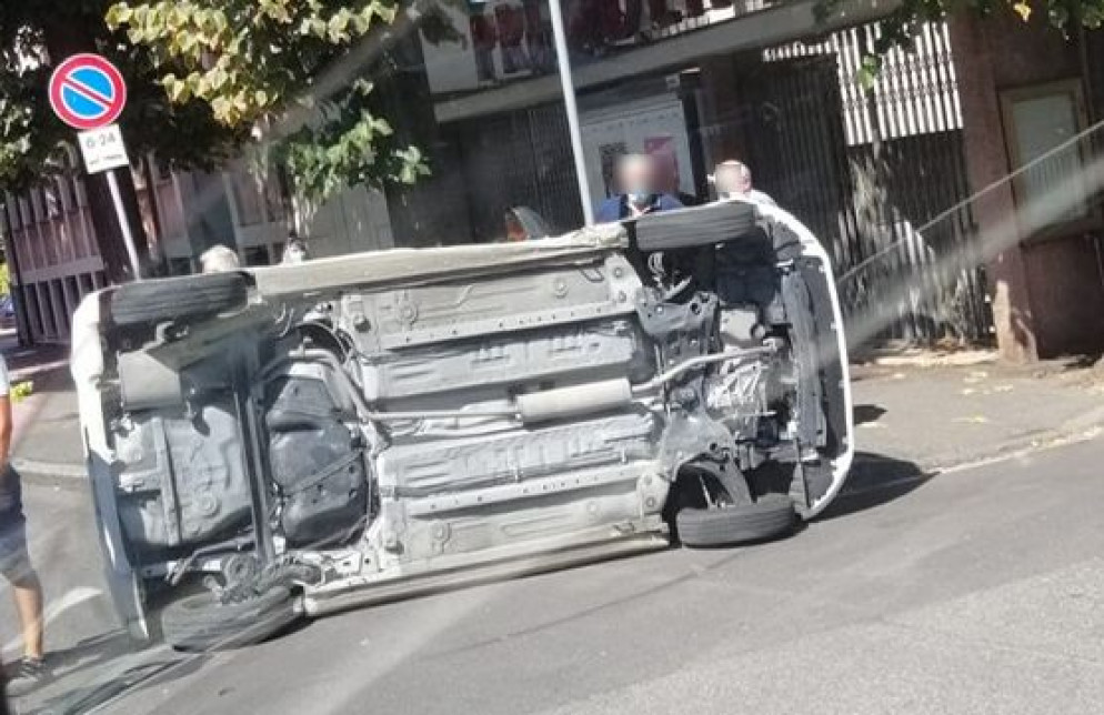 Incidente stradale in via Manfredi, auto ribaltata su un fianco. Un ferito